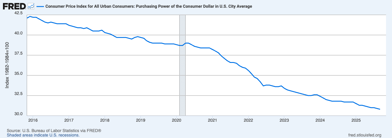 That’s a decline of over 26% in purchasing power in just ten years. Same currency. Same decade. Completely different conclusion.